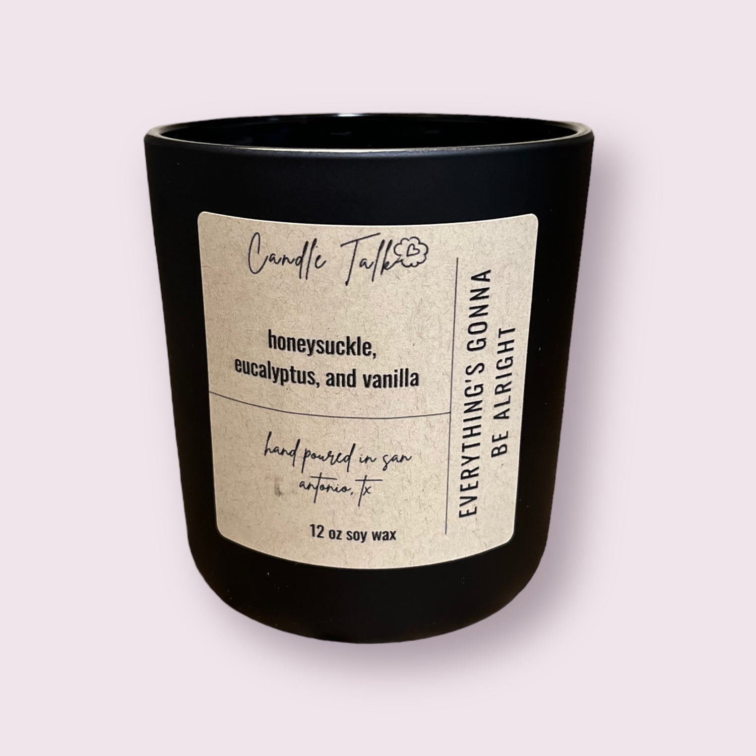 Made with Honeysuckle, soothing for anxiety, this candle also has vanilla which promotes relaxation and sleep. Eucalyptus, helps with focus, clarity and energy. Burn this when you need a reminder that everything’s gonna be alright!